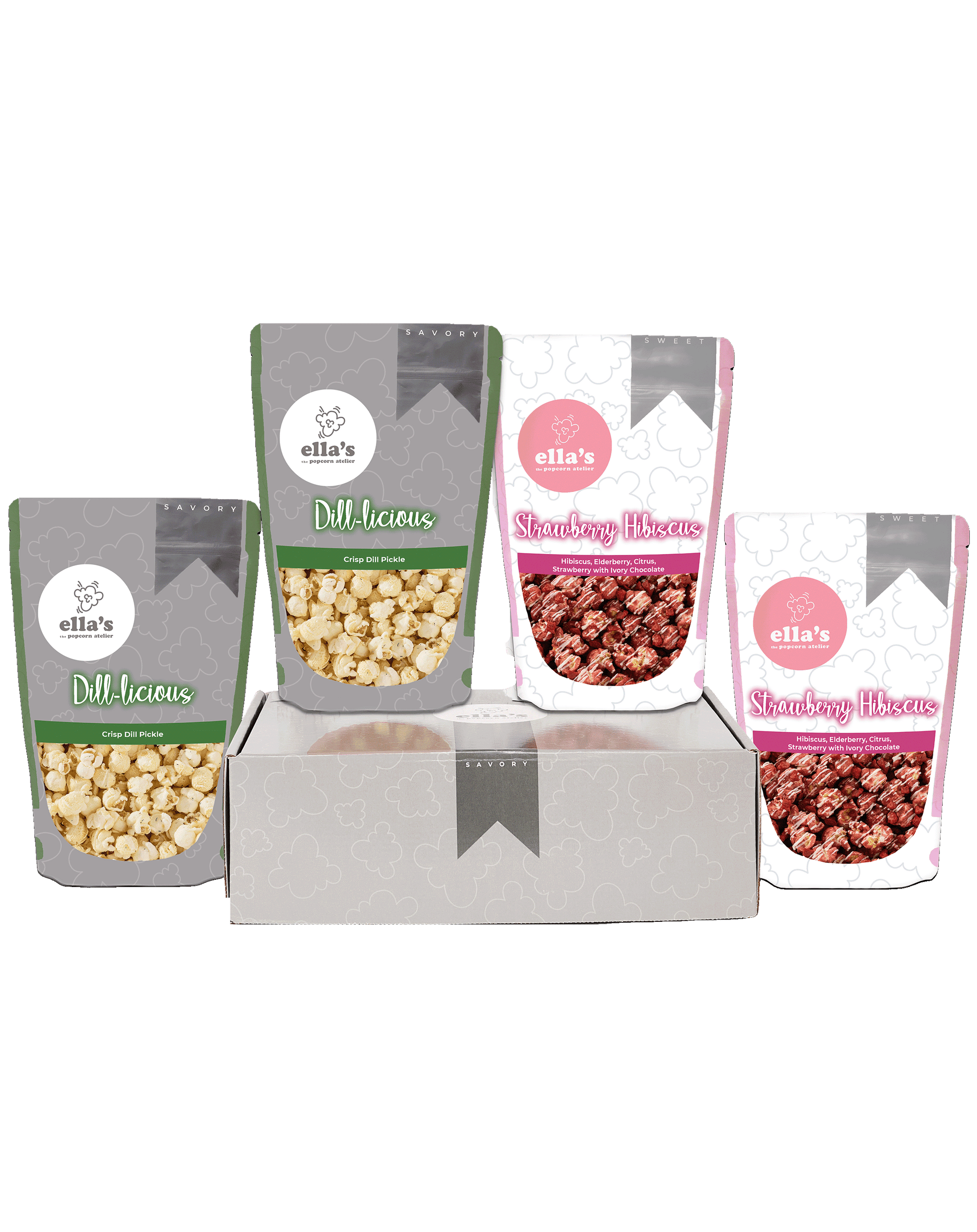 Ella's Popcorn: It's Wicked Good! Box. A spellbinding mix of flavor and fun — this limited-edition box includes 4 bags total: 2 Dill Pickle and 2 Strawberry Popcorn. A little sweet, a little sassy, and totally wicked. Perfect for gifting, snacking, or conjuring a cozy movie night.